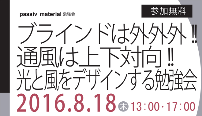 - 2016/8/18 【passiv material】ブラインドは外外外!!通風は上下対向!!光と風をデザインする勉強会