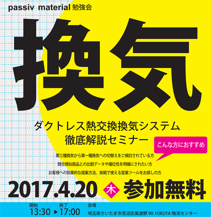 - 2017/04/20 passiv material勉強会 ダクトレス熱交換換気システム 徹底解説セミナーを開催いたします!
