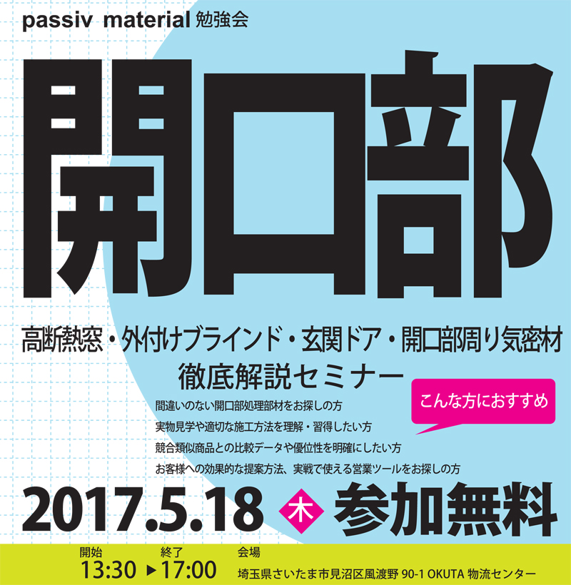 - 2017/05/18(木) passiv material勉強会 開口部(高断熱窓・外付けブラインド・玄関ドア・開口部周り気密材) 徹底解説セミナーを開催いたします!