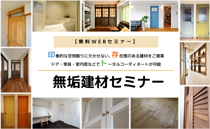 - 【8・9月開催・無料WEBセミナー】印象的な空間創りに欠かせない、存在感のある建材をご提案!ドア・家具・室内窓などでトータルコーディネートが可能な「無垢建材」セミナー