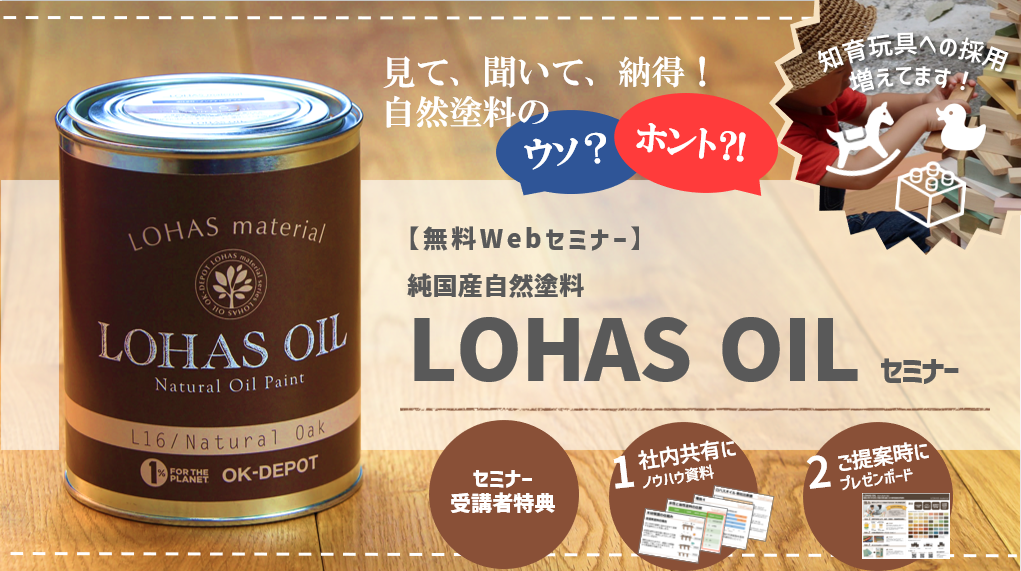 - 【12月開催:無料Webセミナー】見て、聞いて、納得!自然塗料のウソ?ホント!? 純国産自然塗料 LOHAS OILセミナー