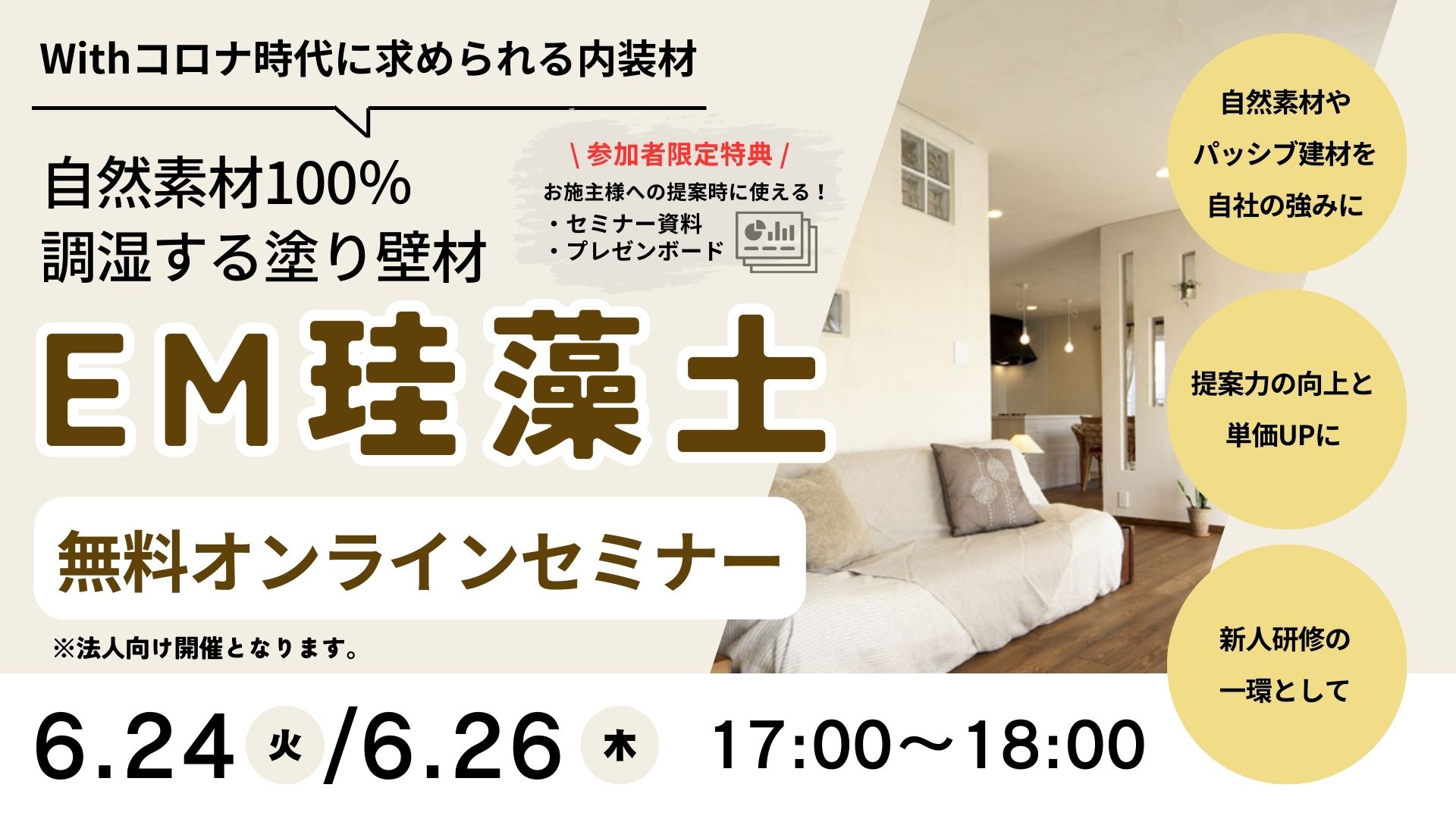 - 【11月開催:無料WEBセミナー】Withコロナ時代に求められる内装材 EM珪藻土セミナー
